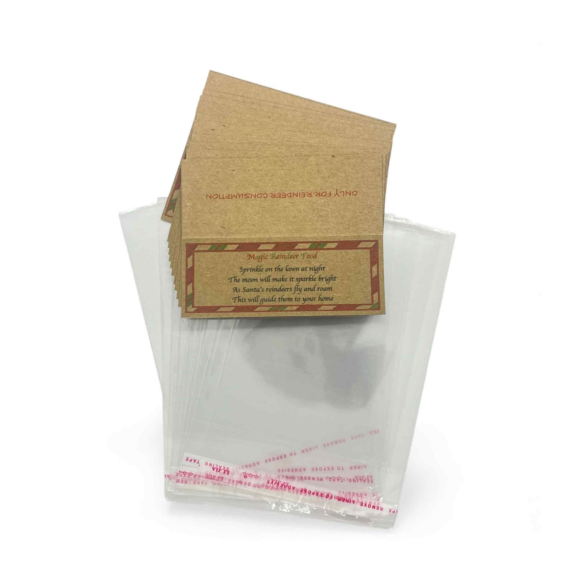 Bring the magic of Christmas Eve to life with these enchanting DIY Magic Reindeer Food packets! This set includes 12 x charming kraft paper card toppers with 12 x clear cellophane bags, perfect for creating memorable Christmas Eve traditions. Each card features a delightful poem that reads 'Sprinkle on the lawn at night, The moon will make it sparkle bright, As Santa's reindeers fly and roam, This will guide them to your home.' These packets are ideal for Christmas Eve boxes, stocking fillers, or special holiday activities with children. Simply fill the provided bags with your chosen reindeer treats (not included) and distribute them on Christmas Eve. Bags are 10cm x 14cm (10cm x 10cm once folded over)