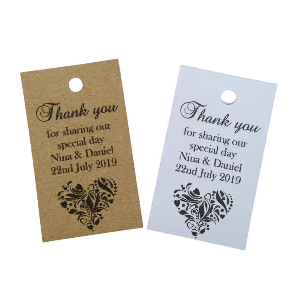 Looking for that finishing touch to add to your favours? Then these are perfect | Measuring 3.5cm x 6cm and printed on 250gsm card or higher | Any wording | This listing is for multiples of 50 but any quantity is possible.