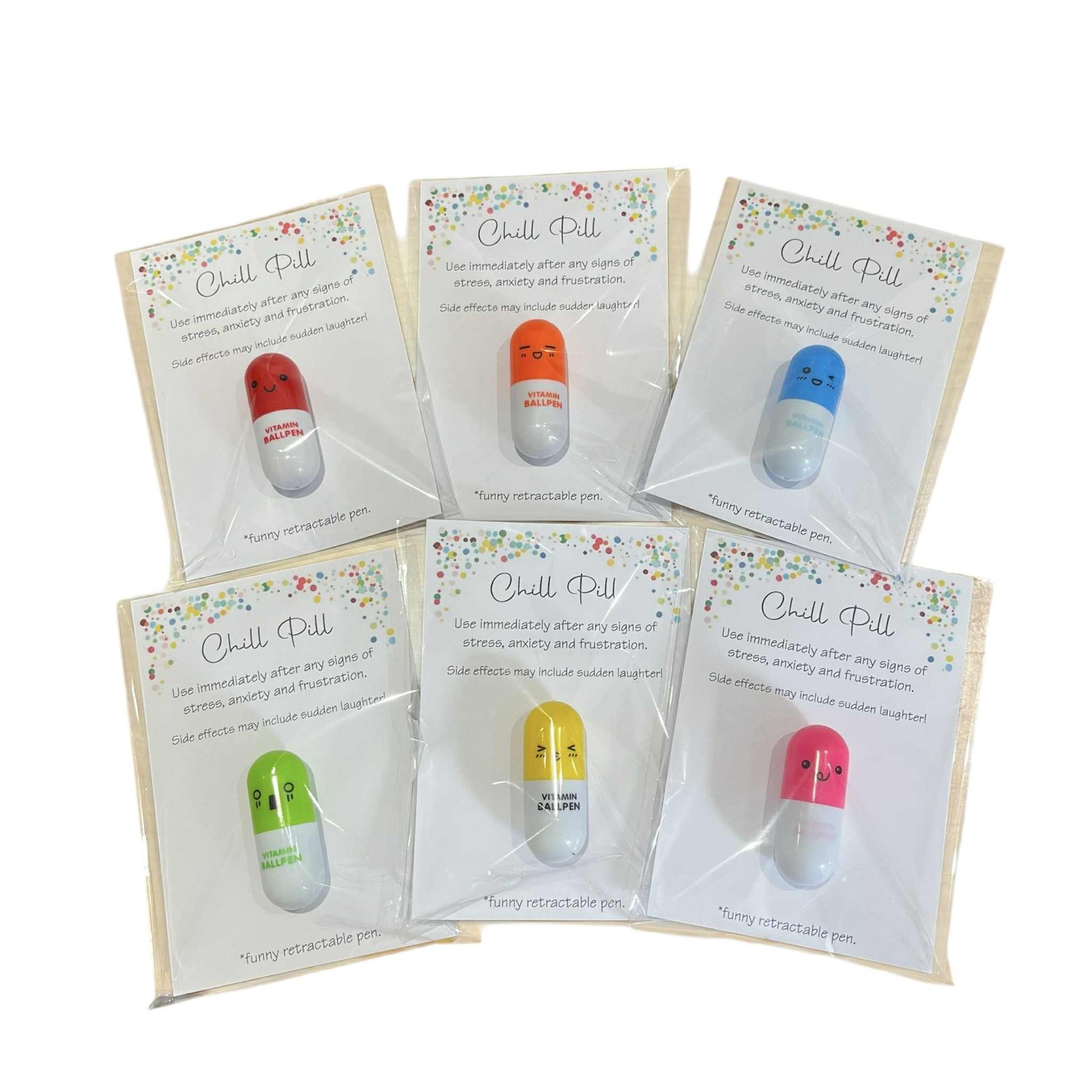 Introducing the Chill Pill Retractable Pen - your perfect companion for adding a dash of humour to stressful days! This delightful novelty pen features an adorable pill-shaped design with charming funny faces that are sure to bring a smile to anyone's day. The pen comes in vibrant colours with a clever retractable mechanism for easy use. Perfect as a quirky desk accessory, party favour, or light-hearted gift for friends and colleagues. The playful packaging suggests using it 'immediately after any signs of stress, anxiety and frustration' with potential side effects of 'sudden laughter!' | Pills are 6cm and 12cm when pulled out and used as a pen | Colours selected at random.
