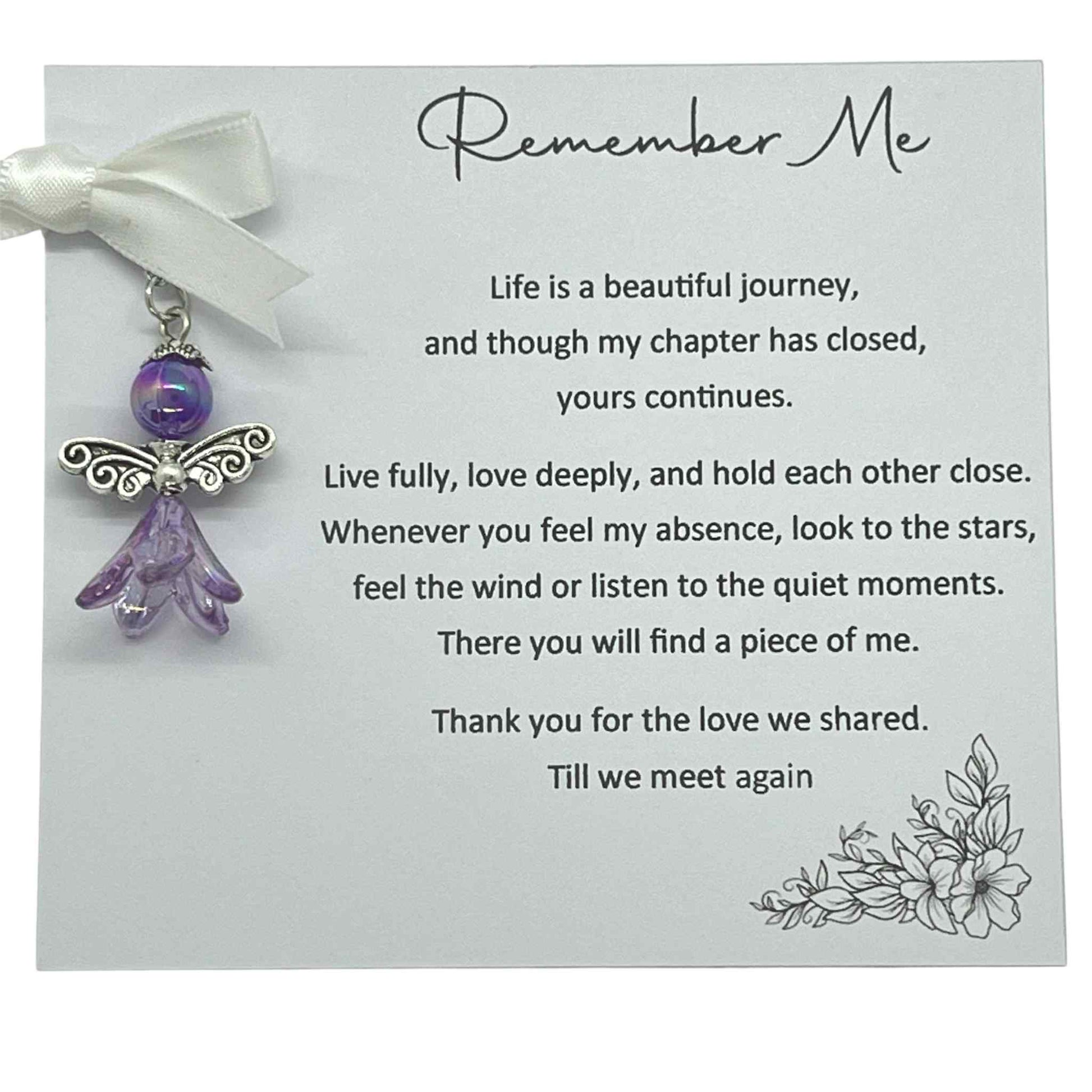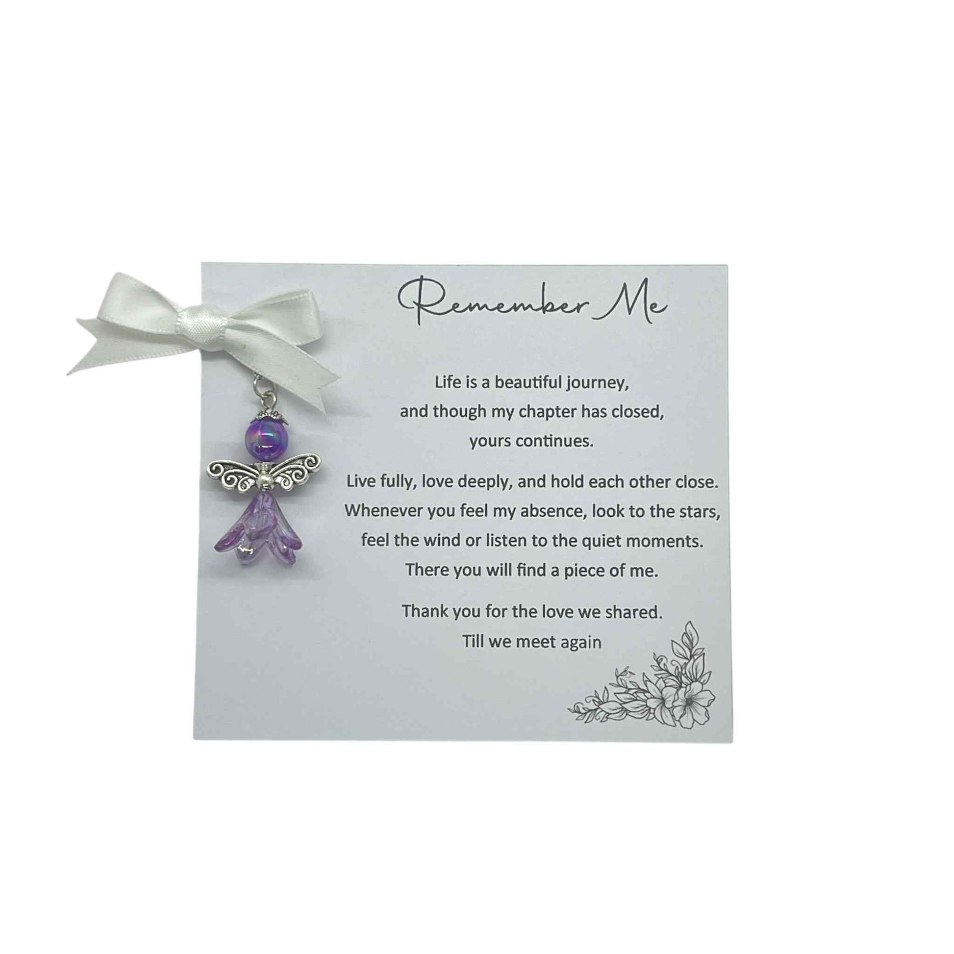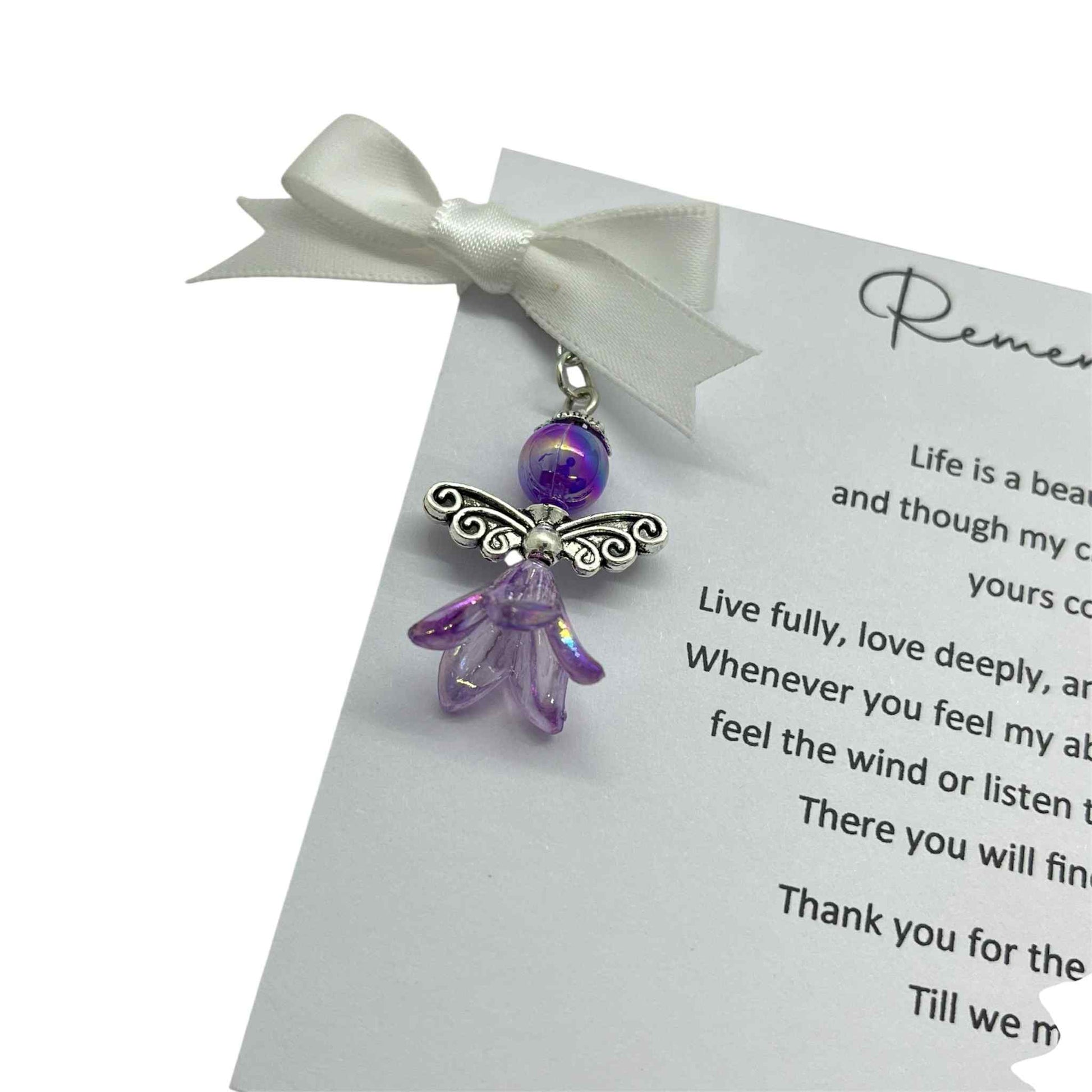 This touching Guardian Angel remembrance charm serves as a beautiful keepsake to honour cherished memories. The delicate design features an angel figure crafted with translucent crystal-like elements and elegant silver-toned wings adorned with intricate scroll details. Each charm comes beautifully presented on a thoughtful message card with a pristine white ribbon, making it a meaningful memorial favour or sympathy gift. Cards are 10cm x 9cm and angel colours are picked at random although happy to help if you wanted something mor specific.