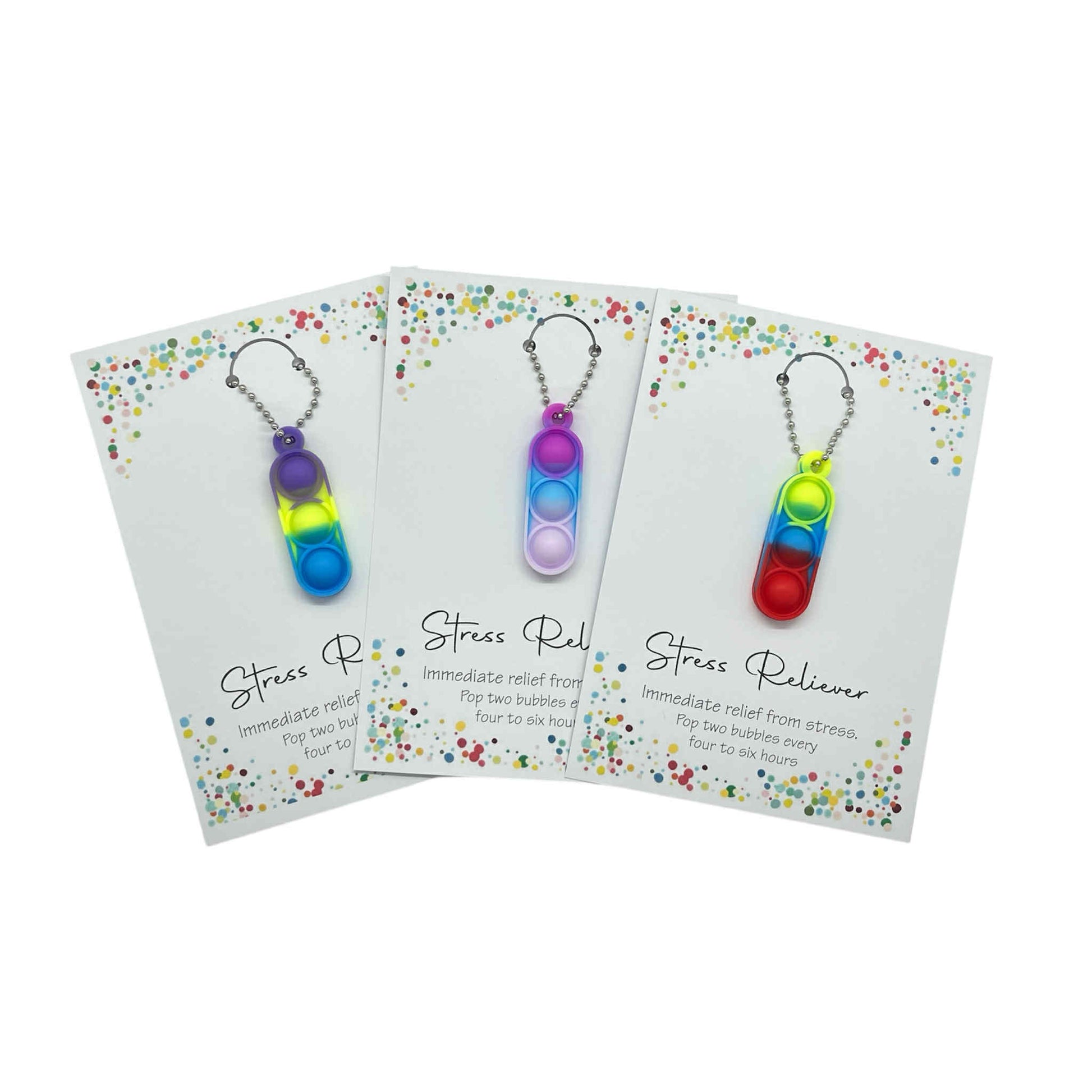 Introducing the perfect stress-relieving companion for your daily life! This delightful novelty stress reliever features a vibrant tri-colour design, attached to a stylish silver ball chain. The unique bubble-popping mechanism provides immediate relief from stress, with a recommended dosage of popping two bubbles every four to six hours. Perfect as a quirky stocking filler, secret Santa gift, or party favours, this entertaining gadget brings a splash of colour and fun to any occasion | Colours picked at random | Cards are A6.