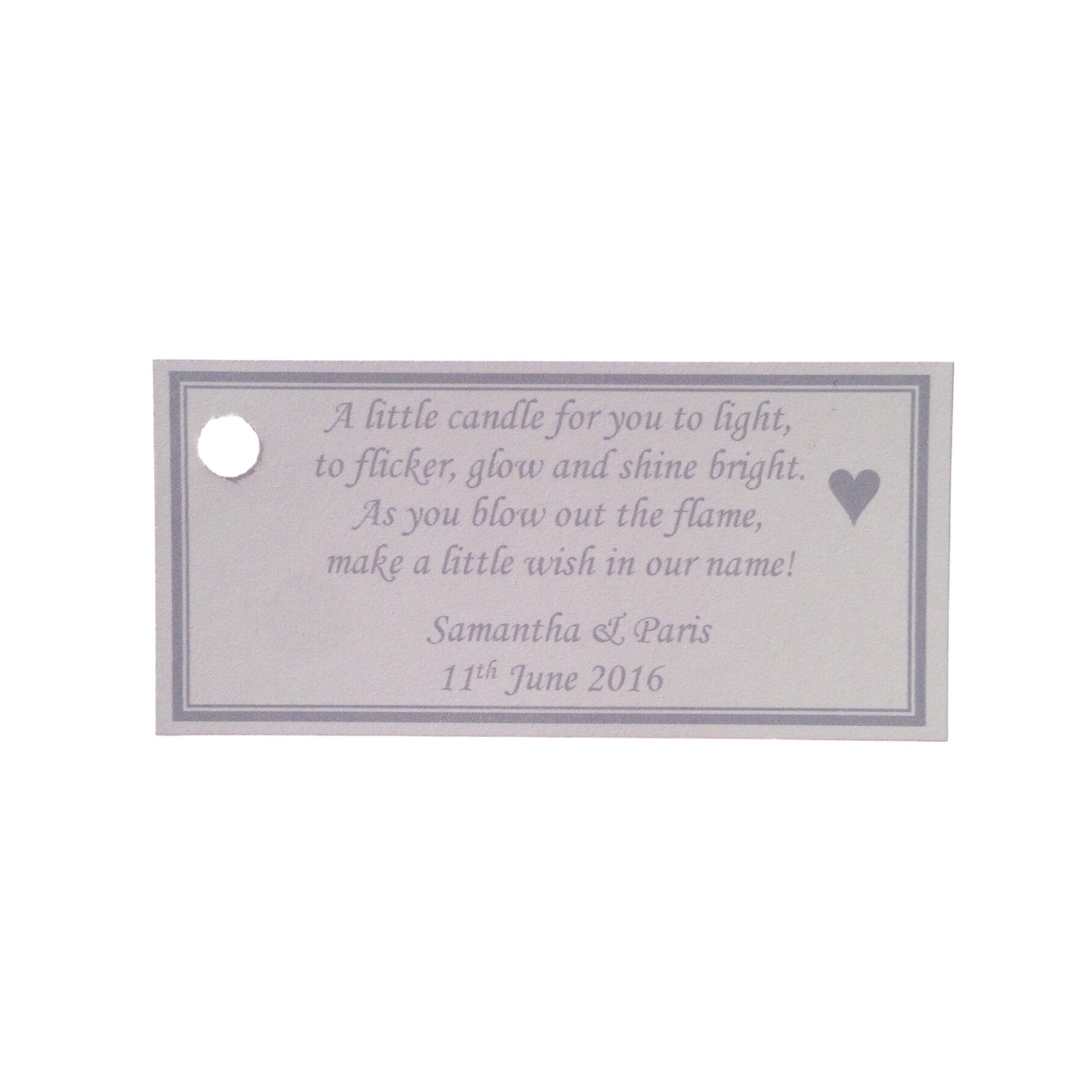 Celebrate your special day with these personalised wedding favour candle tags. Featuring a heart-shaped design and a charming poem, they make a thoughtful gift to thank your guests for attending your wedding. The tags are made of card material and can be personalised with the names and date of your wedding. Add a touch of love to your wedding favours with these multicoloured tags that are sure to impress your guests.