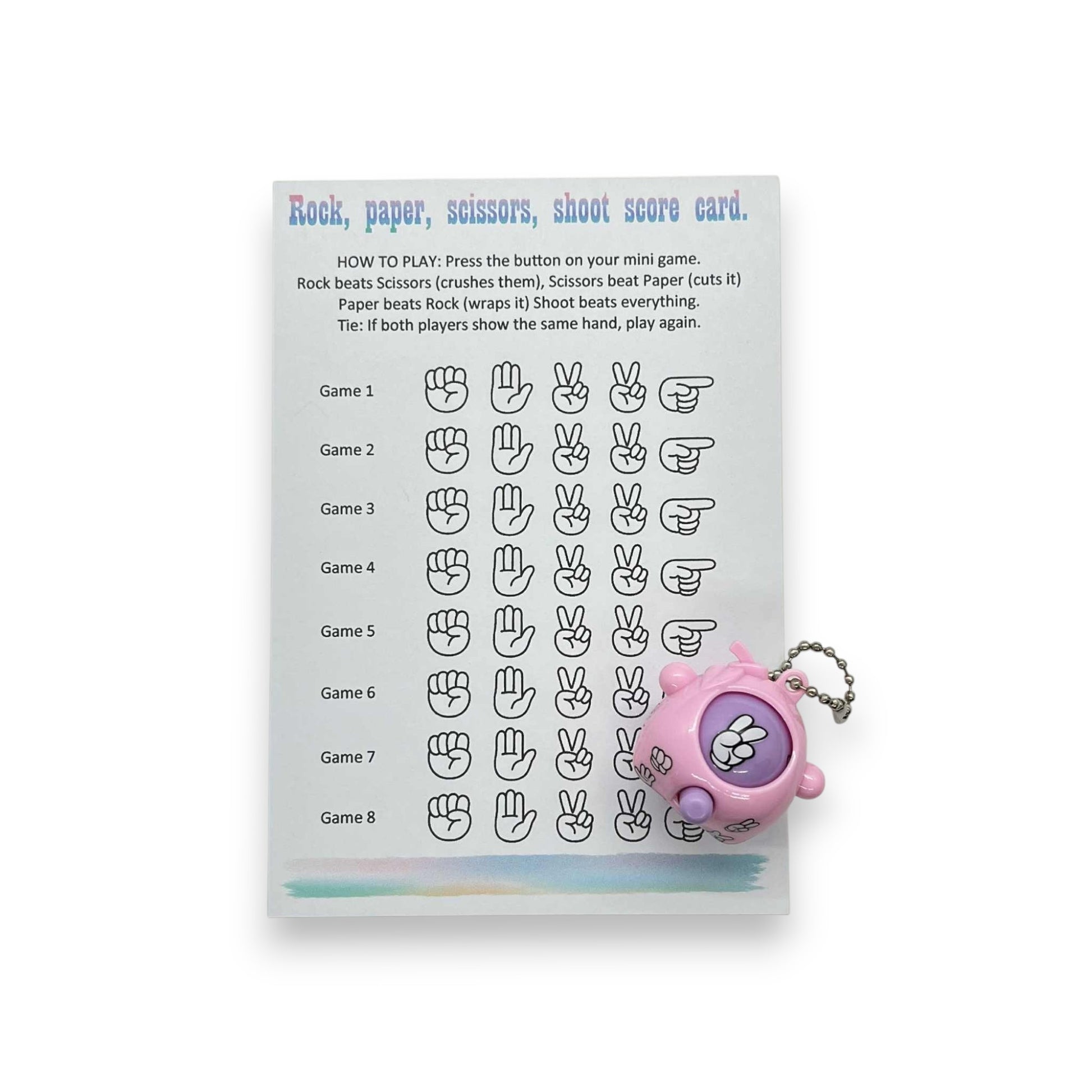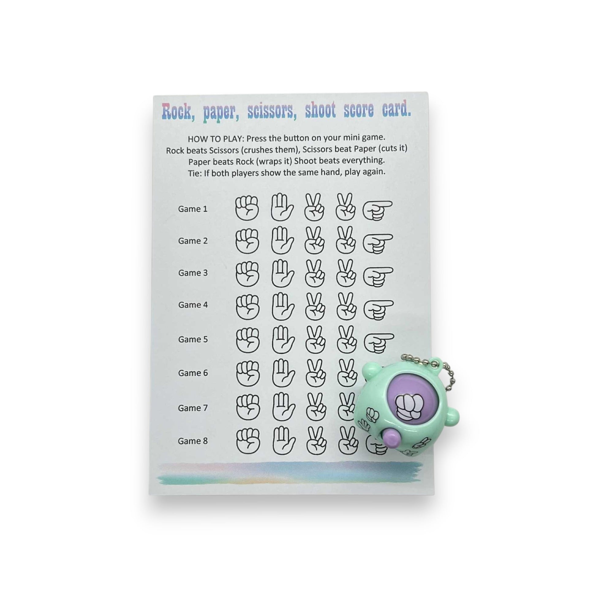 Bring the classic game of Rock, Paper, Scissors to life with this delightful novelty toy! Perfect for party bags and stocking fillers, this interactive score card comes with adorable mini-game keychains in charming pastel colours. Play against the game or with a friend. Toys are picked at random but please do ask if you wanted a specific colour and we will try to assist. Score cards are A6 in size and printed on 250GSM card.